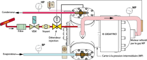 Régulation de la pression d'évaporation Réintégration de l'huile frigorifique.
